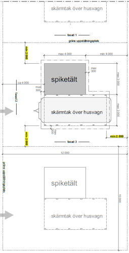 Inom campingområden med detaljplan fastställer planbestämmelserna riktlinjerna. Inom områden utan detaljplan är det upp till upplåtaren/campingen att lämna riktlinjer. Samhällsbyggnadsnämnden visar exempel på hur en anordning med spiketält och skärmtak över husvagn kan tillåtas.